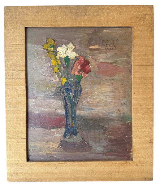• Flavio DE CARVALHO (1899-1973) - oleo s/ madeira, "vaso de Flores", Jequitimar Guarujá 1968, medindo: 49 cm x 39 cm e 54 cm x 64 cm