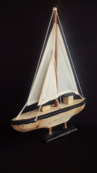 • Veleiro decorativo em bloco de madeira com velas de tecido. Medida 30x40cm.