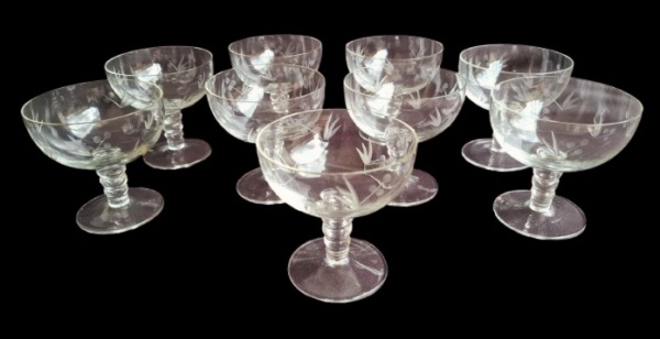 • Nove taças em cristal  translúcido, para Champangne/sobremesa , estilo coupe, com pé canelado,  lapidada com decoração de ramas.
