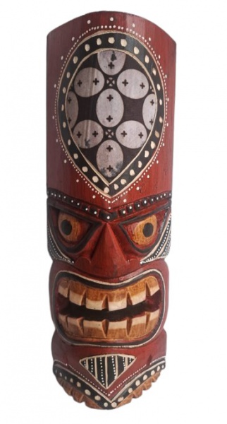 • Máscara de origem asiática esculpida em bloco de madeira com rica policromia. Medida 31 cm de altura.