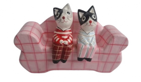 • Belo e gracioso casal de gatos no sofá, esculpido em bloco de madeira. Medida  8,5x12cm.