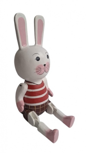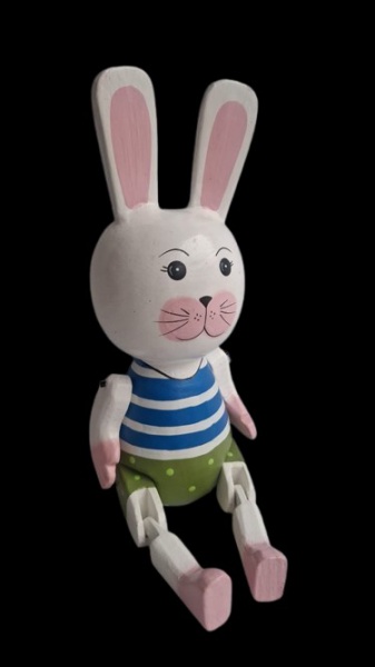 • Lindo coelho articulado confeccionado em madeira ricamente policromada. Medida 27 cm de altura.