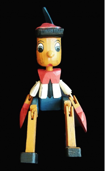• Grande pinóquio articulado em madeira ricamente entalhada e policromada. Medida total de 45cm.