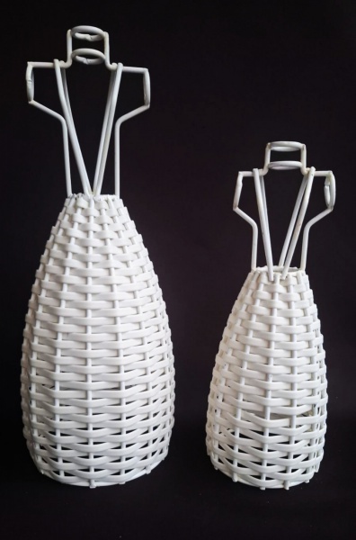 • Par de porta bijuterias, representando figura feminina, confeccionada em metal e com saia de palha sintética. Medidas 30 cm Peça sem uso.