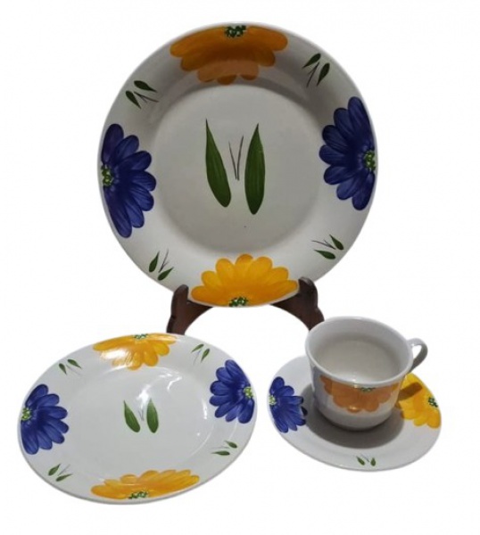 • Lote contendo prato de bolo, prato de sobremesa e xícara com pires. Medida do prato de bolo 27 cm.