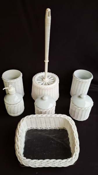 • Lote contendo 7 peças de utensílios para banheiro, confeccionados em porcelana e palinha sintética. Peça sem uso.