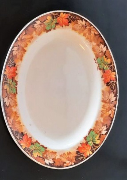 • Travessa em porcelana inglesa J&G Meakin., decorada com folhas em tons de laranja e marrom. - Medias: 29x22