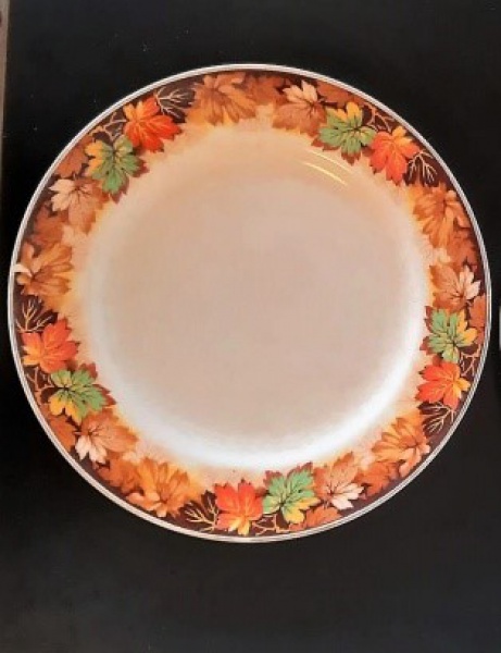 • Prato em porcelana inglesa J&G Meakin., decorada com folhas em tons de laranja e marrom. - Diâmetro: 23 cm