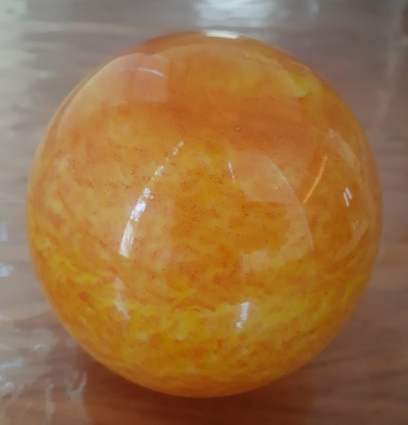 • Esfera em vidro provavelmente Murano em tons de amarelo alaranjado, com superfície lisa e polida, exibindo um padrão marmorizado suave. Seu brilho e variações de cor criam um efeito visual atraente, sugerindo ser feita de vidro ou pedra polida. A peça é vibrante e elegante, perfeita para decoração. Altura: 12 cm e Circunferência: 14 cm