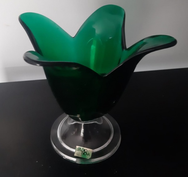 • Delicado enfeite em vidro na cor verde, com pé transparente e pontas recortadas em forma de pétalas. Adquirido no STUDIO NOVA, Portugal. Altura: 18 cm - Lote com pequeno bicado.