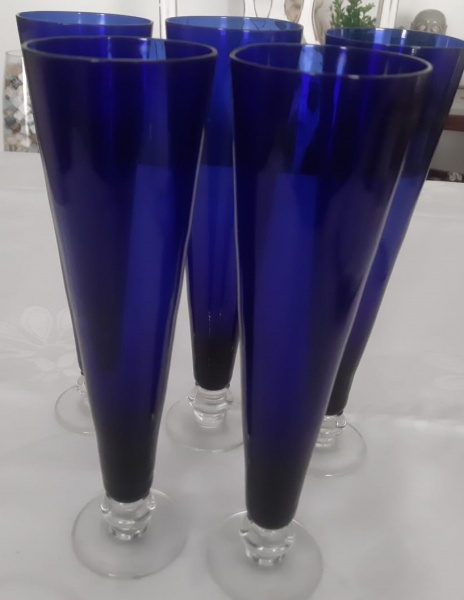 • Jogo de cinco taças tulipas em vidro na cor azul cobalto - Altura: 24 cm