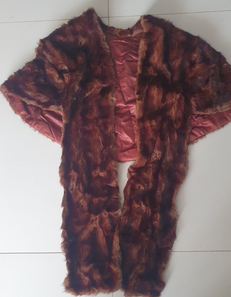 • Casaco ou estola de pele, de cor castanho-avermelhada, com um forro de cetim . O objeto é identificado como uma estola provalvelmente de pele da Larchmont Furrier de Tacoma, datada da década de 1960.