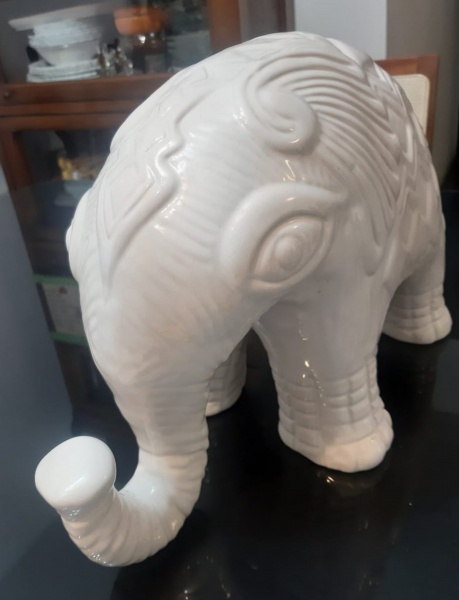 • Escultura de elefante de porcelana branca com detalhes em relevo, que parecem ser esculpidos diretamente na superfície. O elefante tem um acabamento vitrificado, proporcionando um brilho suave que reflete a luz. Suas características, como os olhos e as orelhas, estão bem definidas com texturas onduladas e padrões simétricos que cobrem boa parte do corpo. A tromba é levantada, uma posição tradicionalmente associada a boa sorte. As patas do elefante são curtas e robustas, e o corpo possui uma postura sólida e estável. A peça é decorativa e possui um ar elegante, destacando-se pela simplicidade da cor e pela riqueza dos detalhes esculpidos. LOTE COM RACHADO NA TROMBA E COM PEQUENO LASCADOS. Medidas:36x17x16 cm