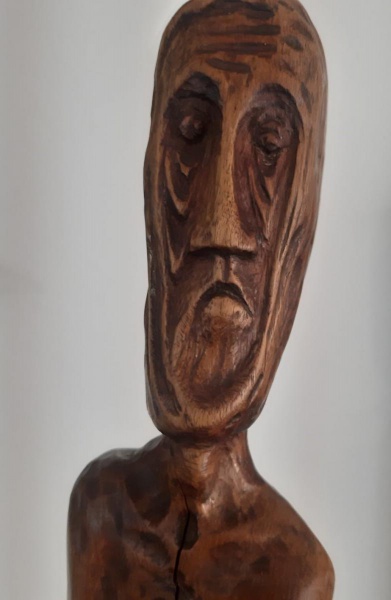 • Pedro Miranda - Arte Popular - Escultura em madeira entalhada representando "Andarilho". Base assinada e datada 68. .Escultura em madeira de um homem com braços longos. A figura é cuidadosamente talhada, exibindo detalhes meticulosos nas feições do rosto e na musculatura dos braços. A madeira, de tom marrom claro, revela os veios naturais, adicionando uma textura rica e orgânica à peça. A peça é montada sobre uma base simples de madeira, que serve de suporte e realça a figura sem desviar a atenção dela. No geral, a escultura evoca uma sensação de harmonia e equilíbrio, misturando elementos realistas com um toque de abstração devido à desproporção dos braços. Altura: 76 cm - Medidas: 16x14 cm( base)