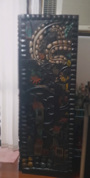 • Painel decorativo em madeira esculpida, atribuído ao escultor baiano Agadamar, com entalhes em alto-relevo que remetem ao estilo asiático ou colonial. A peça apresenta dragões, pássaros e elementos florais ricamente trabalhados. Possui acabamento em madeira escura, com detalhes em branco, laranja e dourado que realçam os relevos. Trata-se de uma peça artesanal de caráter colecionável, pesando aproximadamente 80 kg