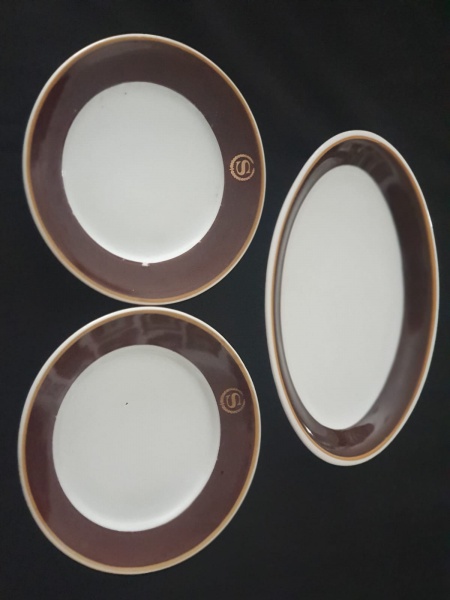 • Polovi germer - antigo par de pratos de sobremesa em porcelana branca e travessa, com friso marrom e monograma do hotel Sheraton em dourado. 16 cm ( prato) e 23x15 cm ( travessa)