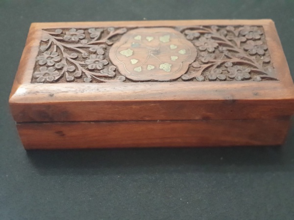• Caixa em madeira  entalhada, tampo com reserva e detalhes ao centro -. Dimensões 19x9x5,5 cm
