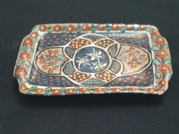 • Pequena bandeja decorativa em cerâmica esmaltada,  de sabão, com um padrão floral e geométrico pintado à mão. Medidas: 16x9,5 cm