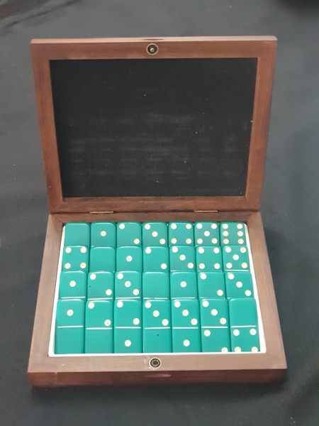 • Caixa de dominó com peças verdes, possivelmente feitas em baquelite. Acompanha estojo de madeira e apresenta acabamento clássico e bem conservado.