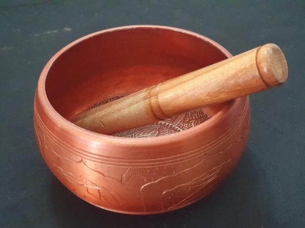 • Tigela tibetana (ou sino tibetano) acompanhada de um bastão de madeira.A peça é feita em metal com tom cobre avermelhado, apresentando gravações decorativas na parte externa e também detalhes no interior. O bastão, usado para produzir o som ao friccionar ou percutir a borda da tigela, é de madeira lisa e clara.O conjunto tem aparência artesanal e costuma ser usado para meditação, relaxamento e práticas sonoras.