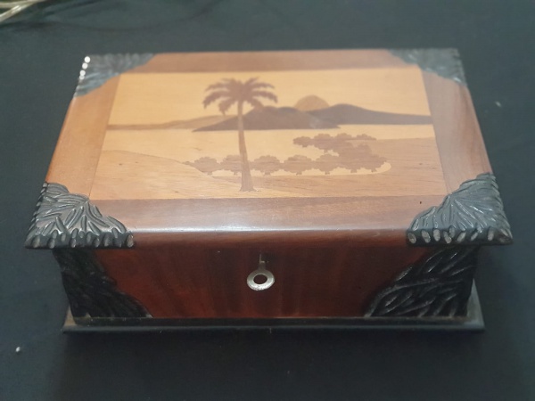 • Caixa de joias antiga/vintage em madeira, com detalhes em embutidos e cantoneiras metálicas decorativas. A tampa exibe um refinado trabalho de marchetaria, formando uma paisagem tropical com palmeiras e montanhas. Os cantos são ornamentados com ferragens em metal ricamente trabalhadas em formato de folhas.- Medidas: 25x18x9 cm