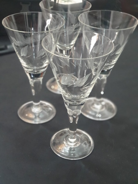 • Quatro taças em cristal com delicados desenhos - Altura : 16 cm e 8 cm de ( boca) - Uma taça com mínimo bicado.