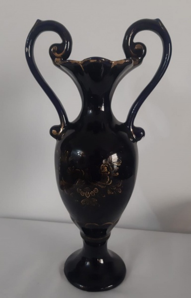 • Elegante ânfora de porcelana azul com detalhes dourados, apresentando um acabamento liso e brilhante com padrões ornamentais pintados à mão. Possui uma forma tradicional, com uma base estreita que se alarga na parte central e afunila no topo, e alças curvas decorativas. O lote tem uma rachadura na base, alguns lascados e dourado desbotado. Altura: 33 cm.