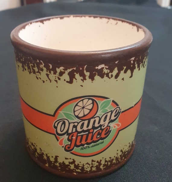 • Pote cilíndrico em louça , estilo retrô, com estampa Orange Juice  100% natural em faixa laranja sobre fundo verde-claro. Interior branco e detalhes em marrom nas bordas, com efeito de desgaste decorativo. Peça decorativa e multiuso. - Altura: 10 cm e Diâmetro: 10 cm