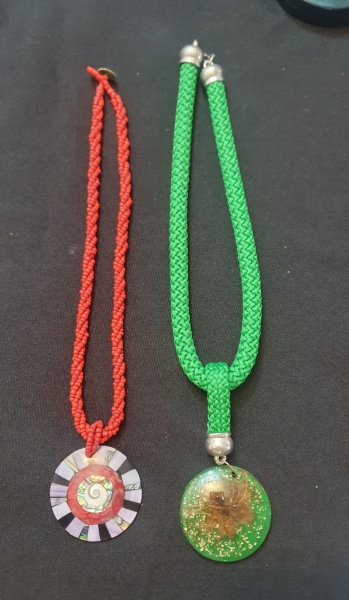 • Dois cordões artesanais: um em contas vermelhas com pingente circular colorido em mosaico e espiral central, de estilo vibrante; outro em fio trançado verde com pingente em resina translúcida, dourados e flor seca, de inspiração natural e orgânica.