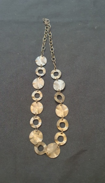 • Cordão em metal dourado envelhecido, composto por discos lisos e vazados em sequência alternada, com acabamento martelado que confere textura. Possui corrente de elos ajustável. Estilo moderno e versátil