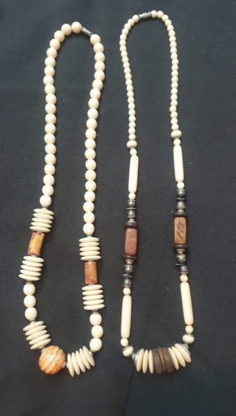• Dois cordões artesanais de estilo rústico, confeccionados com materiais diversos e detalhes geométricos. Um é composto por contas esféricas claras, intercaladas por discos achatados e peças em madeira, destacando-se pelo grande bead arredondado em tom marrom mesclado na parte inferior. Já o outro traz contas menores em tom claro, combinadas com cilindros alongados, madeira escura e detalhes metálicos, conferindo-lhe um visual mais alongado e tribal. Ambos refletem um design étnico e artesanal, de forte apelo decorativo e autêntico.