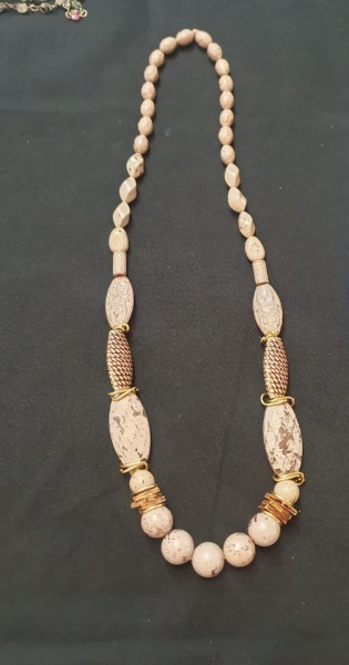 • Peça artesanal de design rústico e elegante, composta por contas em tons de bege claro e marrom, com detalhes que lembram pedras naturais rajadas