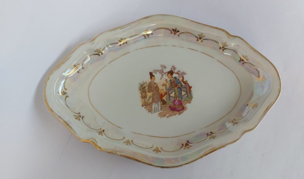 • Travessa oval em porcelana Mauá furtacor, decoração de gueixas ao centro e detalhes dourados. Medidas aproximadas 36 x 24.