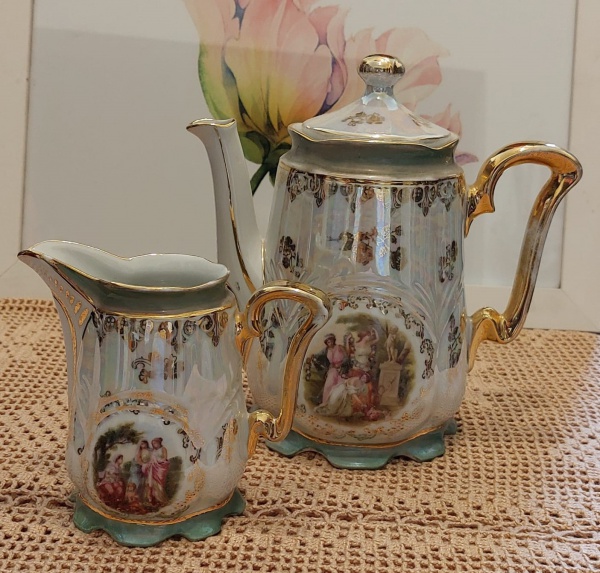 • Antigos bule e leiteira em porcelana com cena galante medindo, respectivamente, 20cm(a) e 11,5cm(a)