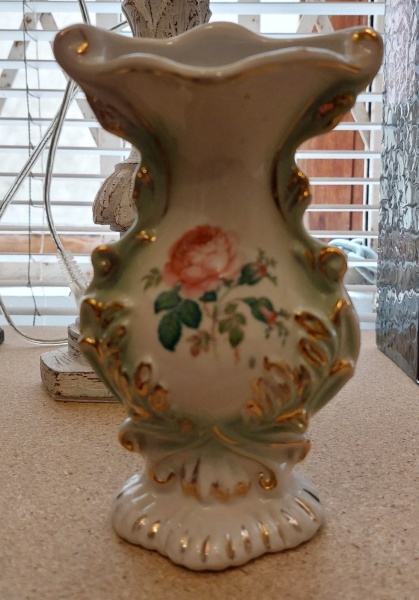 • Vaso clássico em porcelana, detalhes dourados. Apresenta pequeno bicado borda; Medidas aproxim. 16cm altura.