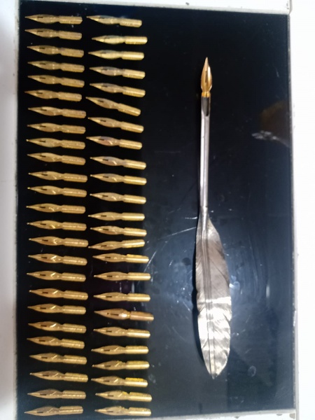 • Belíssima e antiga pena tinteiro, provavelmente em prata de lei, haste finamente cinzelada, com 50 ponteiras provavelmente com banho de ouro. Medidas: 20 cm.