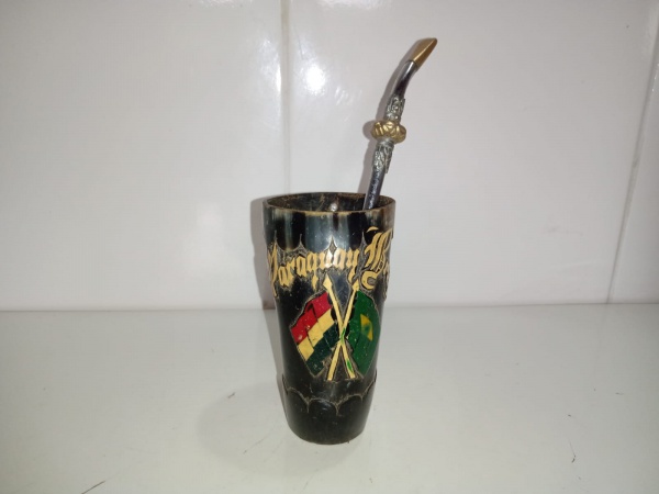 • Kit bomba e cuia de chimarrão confeccionada em chifre natural, Medidas : bomba: 25cm, cuia: 14x8cm.