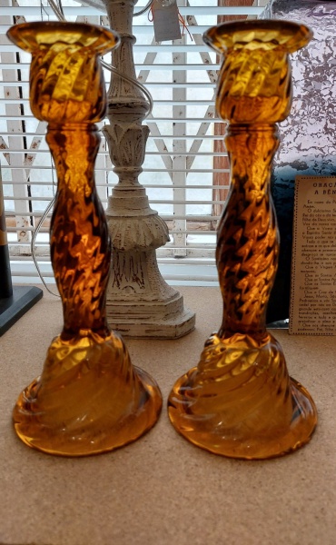 • Par de castiçais em vidro na cor âmbar, decorados com gomos torcidos; Medidas aproxim. 24,5 (a);