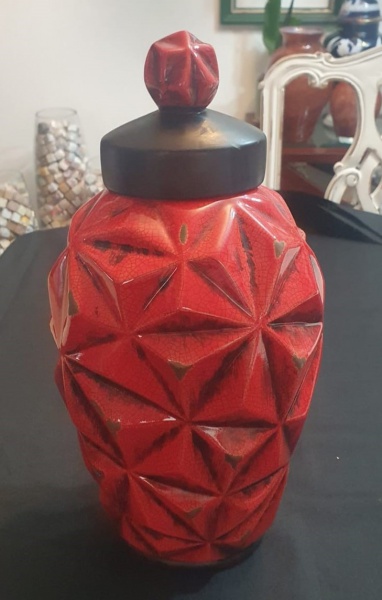 • Vaso decorativo em Cerâmica Vermelha com Tampa Design Geométrico Vintage Este elegante vaso decorativo em cerâmica apresenta um design facetado com relevos geométricos, criando um jogo de luz e sombra que valoriza sua textura tridimensional. A peça é pintada em vermelho vivo com acabamentos envelhecidos, conferindo um ar retrô sofisticado.O destaque está na tampa preta com pegador em forma de losango facetado, harmonizando com o corpo da peça e acrescentando funcionalidade ao design. Ideal para compor ambientes modernos ou ecléticos, o pote também pode ser utilizado como objeto de coleção ou para armazenar pequenos itens.Material: Cerâmica esmaltadaCor predominante: Vermelho com detalhes escurecidos e tampa pretaEstilo: Retrô / Vintage com influência contemporânea, Decoração de salas, aparadores, cozinhas ou espaços gourmet  Apresenta leves desgastes na pintura, característicos de peças com estilo envelhecido - Altura: 40 cm
