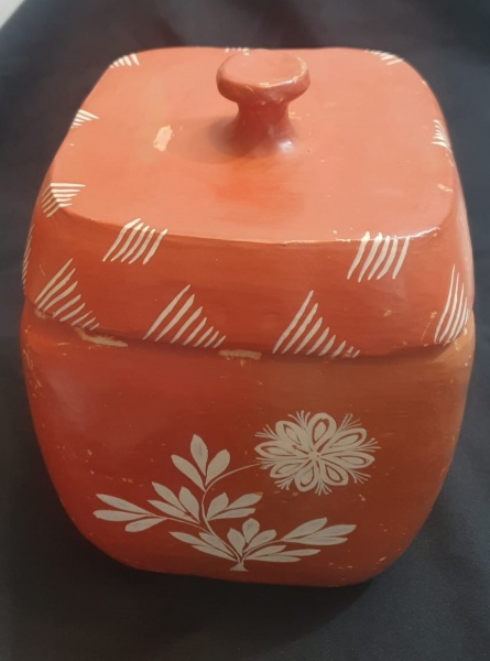 • Pote de cerâmica artesanal com tampa, de formato retangular e cantos suavemente arredondados. Possui pintura em tom terroso avermelhado e delicados adornos brancos feitos à mão: na parte frontal, destaca-se um ramo com folhas e uma flor estilizada; já na tampa, padrões diagonais se repetem ao longo das bordas. O puxador, central, é modelado em forma de botão arredondado, conferindo praticidade e charme. A peça apresenta estilo rústico, com possível inspiração na arte popular indígena.Medidas: 19 x 19 x 29 cm. - Mote com marcas de uso, alguns lascados.