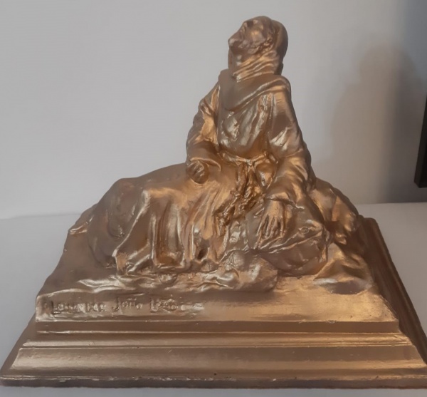 • Escultura em de uma figura sentada, possivelmente religiosa, em postura contemplativa. Na base, há uma inscrição com o nome "João Leão", sugerindo que pertenceu ao deputado, possivelmente como um item de coleção. A escultura foi pintada ou revestida em tom dourado para realçar sua aparência.Medidas: 36x23x26 cm