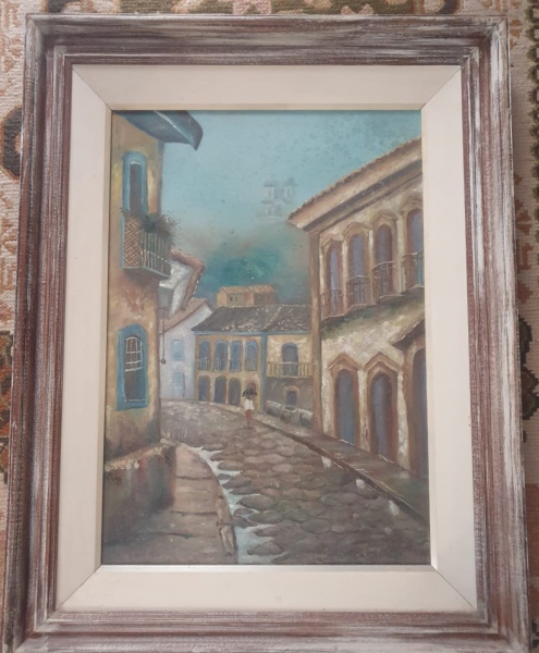 • Quadro  em  pintura O S T ,   rua em estilo colonial, provavelmente inspirada em cidades históricas brasileiras, como Ouro Preto ou Paraty. - Medidas: 67x87 cm e 44x63 cm - Lote com pequenos lascados  na moldura,