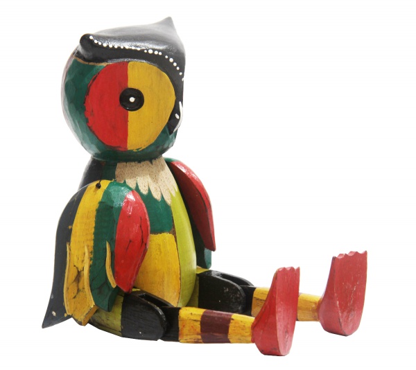 • Simpática e bela coruja articulada, esculpida em bloco de madeira com bela policromia colorida. Medidas 29x12cm.