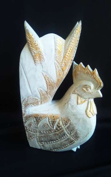 • Galo em bloco de madeira ricamente policromado. Medida 18x32cm.