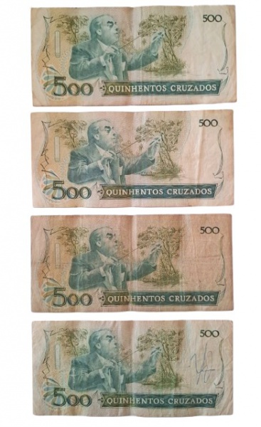 • Lote com 4 (quatro) cédulas brasileiras de 500 cruzeiros.zados série Vila Lobos.