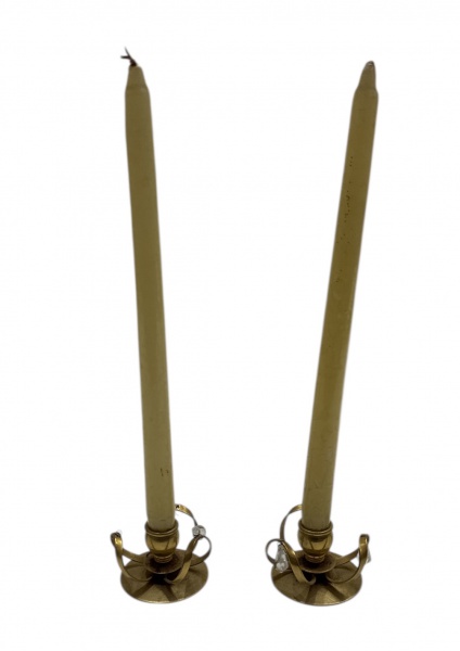 • Par de castiçais em metal dourado, medindo com vela, 25 cm alt.