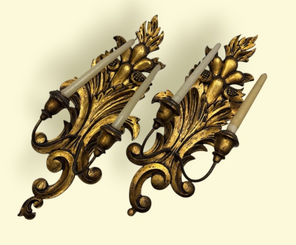 • Par de belos apliques em madeira policromada, medindo: 50 cm alt.