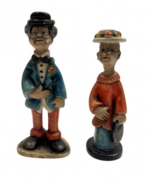 • Par de delicadas esculturas e gesso policromado, medindo: 21 cm e 18 cm alt.