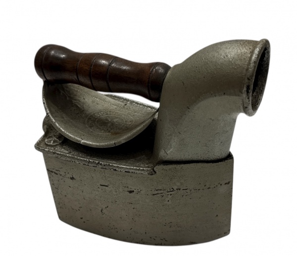 • Antigo ferro de passar em ferro com cano em madeira, medindo: 21 cm x 20 cm