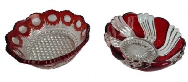 • Lote com 2(duas) tigelas de cristal, Ruby Flash, com padrão decorativo hobnail (pequenas saliências). Medidas 12cm a maior e 11cm a menor.